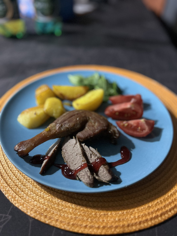 сковородка с филе бедра и отварной картошкой, пиво, молоко, минералка, кола без сахара, блины.