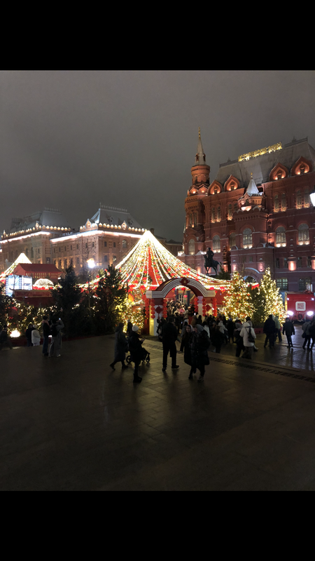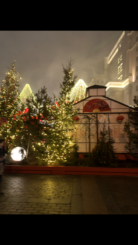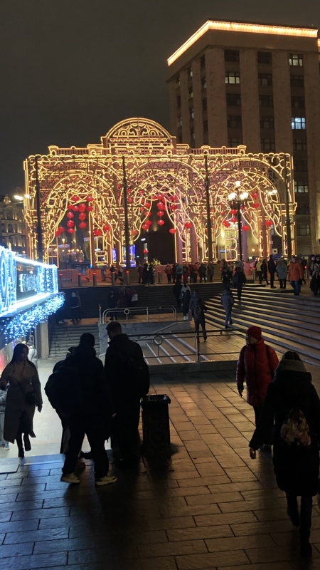 Красиво еще на Тверской площади, тоже много атрибутики, очень нарядно все украсили, музыка приятная, пандочки сидят на лавках -большие мягкие игрушки, ярмарка. Так что можно выйти от метро Пушкинская и пройтись по Тверской улице в сторону Красной площади - там как раз 2 локации будет - Тверская площадь и Манежка, и между ними на Камергерском огромный надувной дракон.