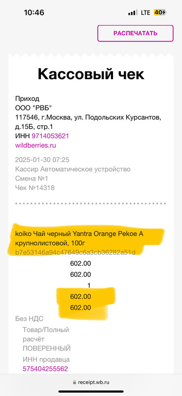 Согласно претензии, товар артикул 277412748 (Чай черный Yantra Orange Pekoe A крупнолистовой, 100г koiko) был приобретен Вами 07 февраля 2025г.