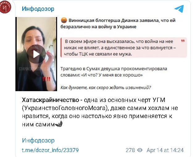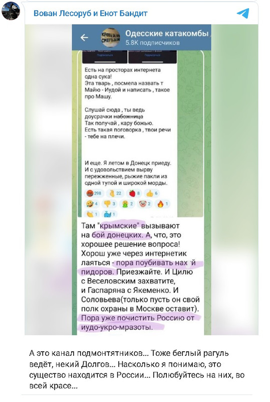 "Коты — это наша любовь. Мы [их] обожаем — я не хочу Зеленского сравнивать с котом. Зеленский — гнида в нашествии кота. Если бы оказался — мы бы задавали, задушили и размазали всмятку".