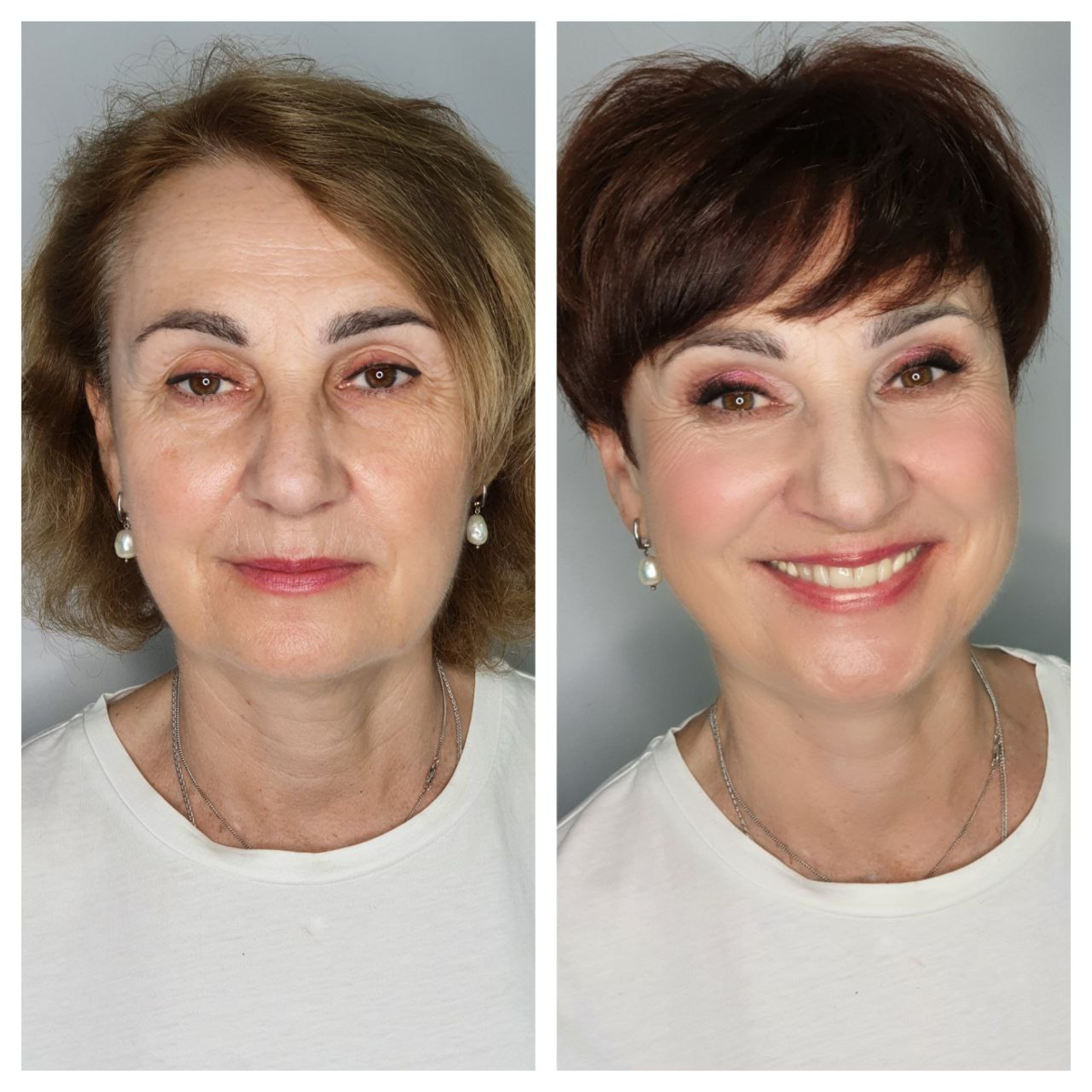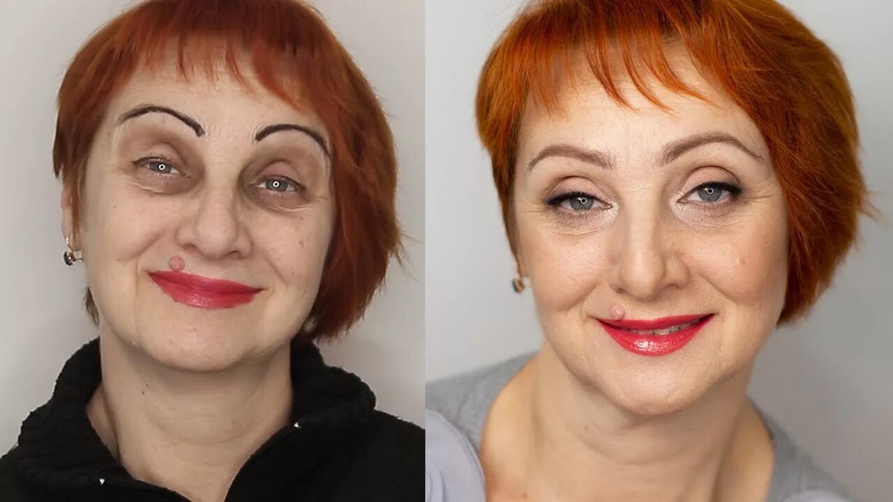 Вам правда нравится заштукатуренное и заблюренное лицо справа? У тети вполне приличная кожа, ей вполне хватило бы освежить стрижку-покраску и подкрасить глаза и губы. Маска из тональника на лице выглядит отталкивающе.