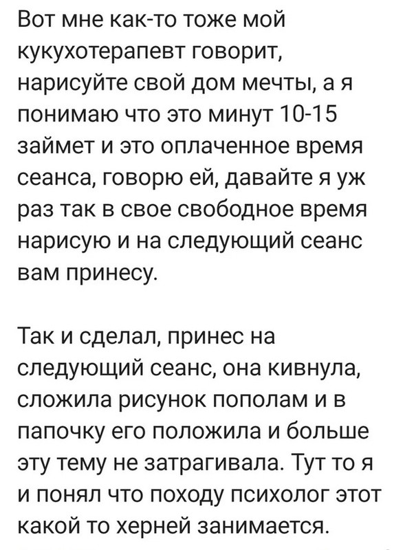 Ой вы сказали, а я поняла, что половину времени годами слушала про личную жизнь психолога и измены ее мужа и то, как она его удержать пыталась. Стоило дорого, и у меня был маленький ребенок, которому эти деньги были не лишние, ипотека, сьемное жилье. Ужас