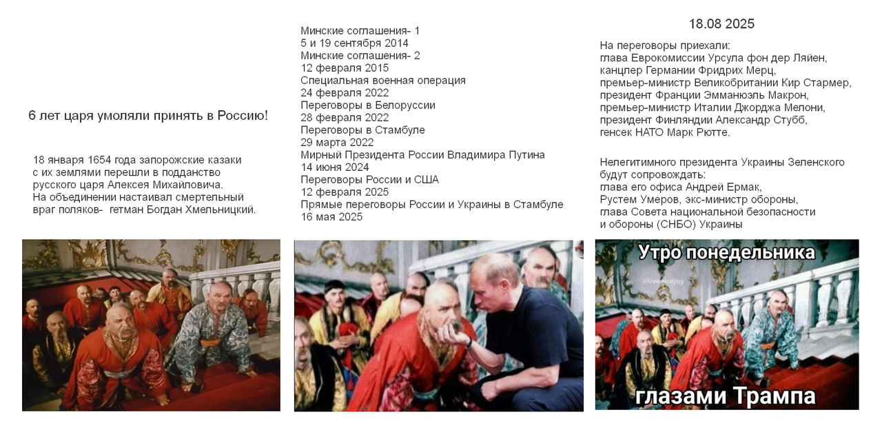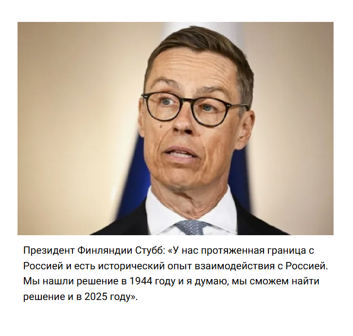 На вчерашней встрече в Вашингтоне президент Финляндии Стубб буквально сказал следующее: «Финляндия имеет протяжённую границу с Россией и имеет свой опыт взаимодействия с этой страной во время Второй мировой войны. Мы нашли решение в 1944 году, и я уверен, что мы сможем найти решение в 2025 году».
