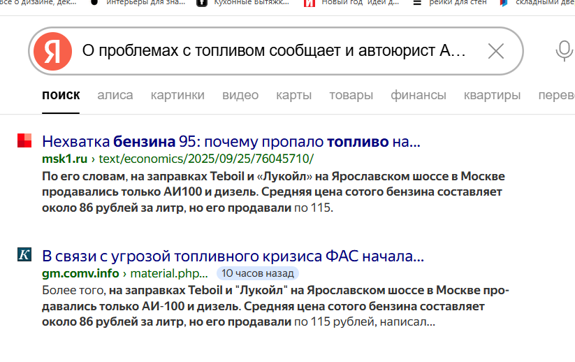 О проблемах с топливом сообщает и автоюрист Александр Шумский. По его словам, на заправках Teboil и «Лукойл» на Ярославском шоссе в Москве продавались только АИ100 и дизель. Средняя цена сотого бензина составляет около 86 рублей за литр, но его продавали по 115.
