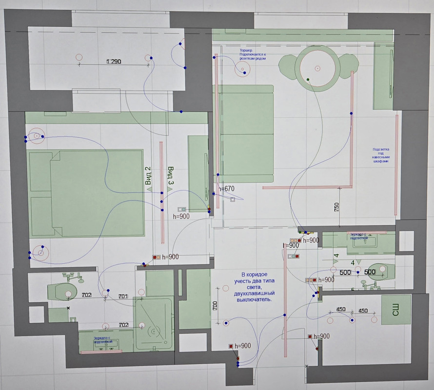 Например... Расположение нужного эл.вывода может зависеть от модулей шкафов (= возможная подсветка в шкафах или расположение точечного светильника перед дверцами, если желаете так, а не внутри светить), от ширины тумбочек возле кровати и самой кровати, чтобы по центрам вывести, если нужна симметрия, от расположения зеркала в прихожей (например), расположения стола в столовой, модулей кухни.....