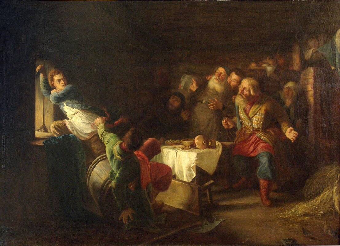 Картина Г. Г. Мясоедова: "Бегство Григория Отрепьева из корчмы на литовской границе".