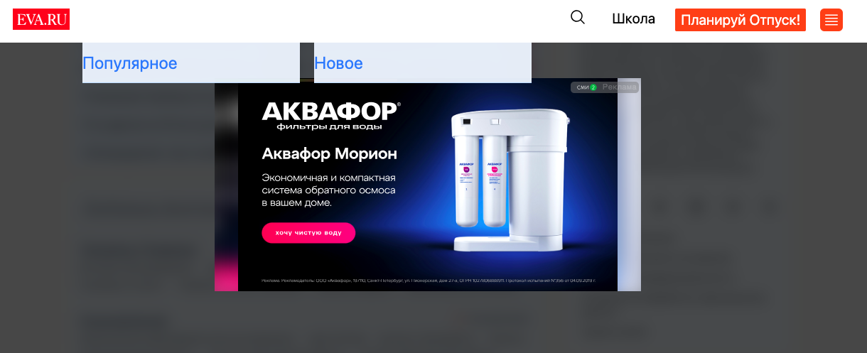 Компьютерная версия, Хром. При переходе между страницами и при входе. Там всегда бывает реклама, но обычно с крестиком. В конце лета была какая-то вода, тогда многие жаловались, не только я . Сегодня вот с аквафором такая же дребедень.
