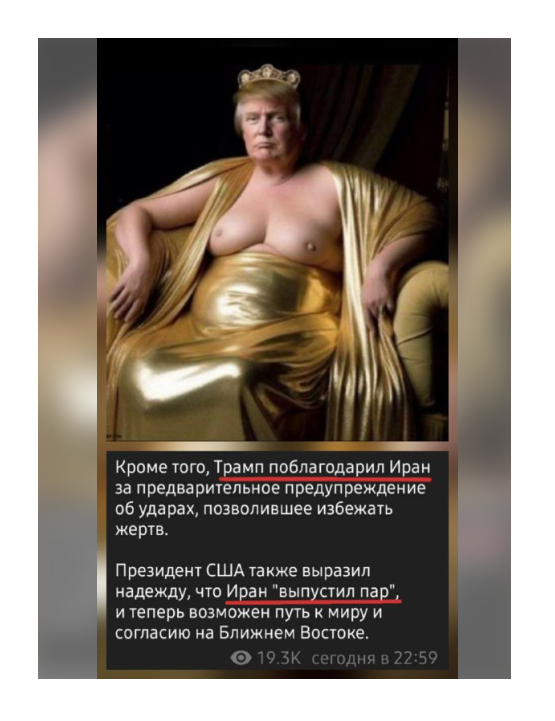 Судя по его реакции, США военного ответа давать на это не будут. Также Трамп подтвердил, что Иран заранее предупредил об ударе, и это позволило избежать жертв.
