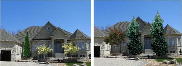 Слева деревья/кусты, справа массивнаа клумба, с кустиками, камнями и т.п у входа 2 вазона массивных. Поскольку дом незеркален, то и зеркальное делать не надо;) МОЕ имхо, а жакалоп сейчас тебе фотку найдет клумбы:)