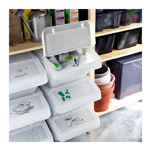 У меня контейнеры из Икеи для сортировки. Они повыше, чем на картинке. Сдаем по мере накопления.
