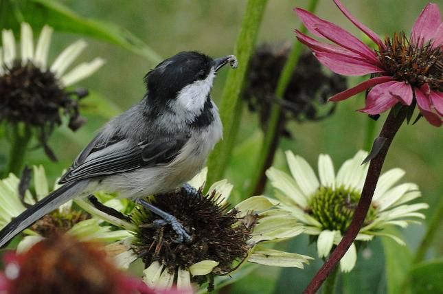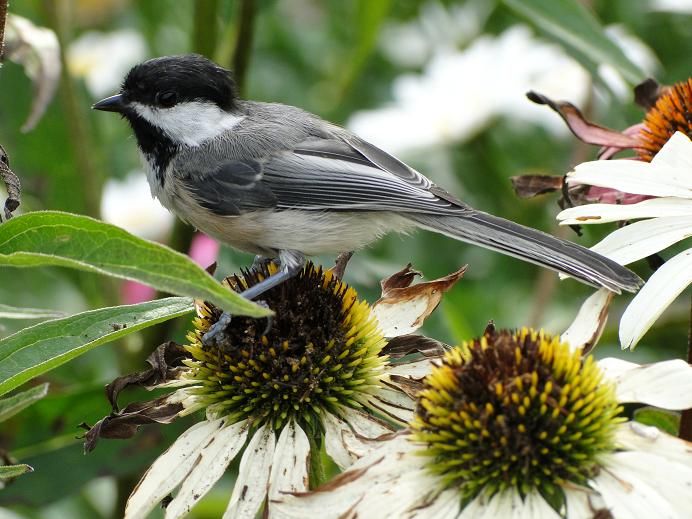 Это Black-capped Chickadee ( Черношапочная гаичка ) целыми днями ковыряет мои цветы - такая нахалка, что я ее наверно голой рукой могкла бы схватить - совсем никого не боится.