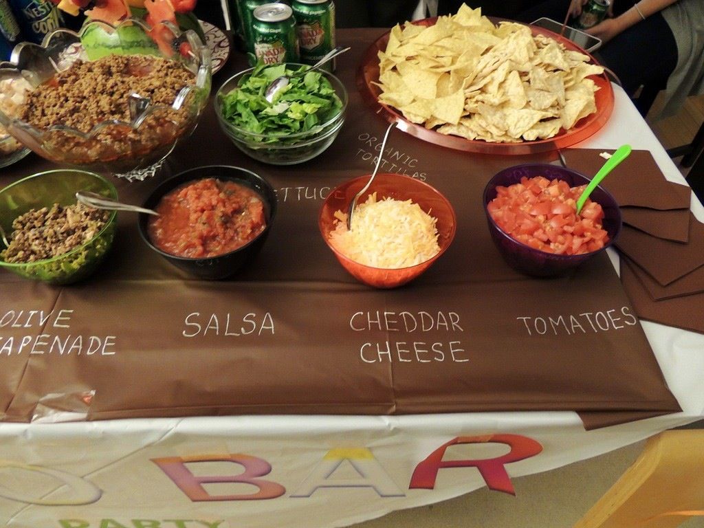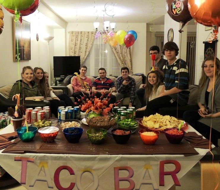 У меня был такой опыт 4 месяца назад, тоже 18-тилетие сына праздновали. Называлась вечеринка surprise taco bar party. Это был полный сюрприз для него, мальчишки и девчонки, молодцы, организовались быстро и тихо:-D. Я за две недели с друзьями сына связалась и объяснила что к чему. Это надо сделать заранее еше и потому, что все парни и девчонки работают и им надо было свои графики на этот день утрясти заранее. У сына подозрений не было, так как они сказали, что работают в этот день:-) сделали с доской плакат с его.фотками с рождения до 18 лет, купили надувные гитары и саксофон для прикольных фоток, шары ( дочины здоровые, а дурачились с шарами - надо было видеть):-D я сейчас на работе, вечером могу вам показать taco bar фото.