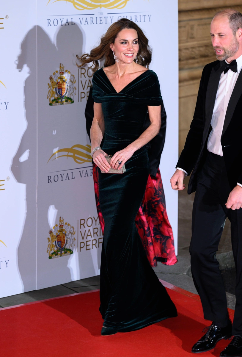 Принцесса выбрала эффектный образ для выхода на Королевском варьете — изысканное бархатное платье благородного оттенка. Ее появление с принцем Уильямом стало главным моментом вечера.