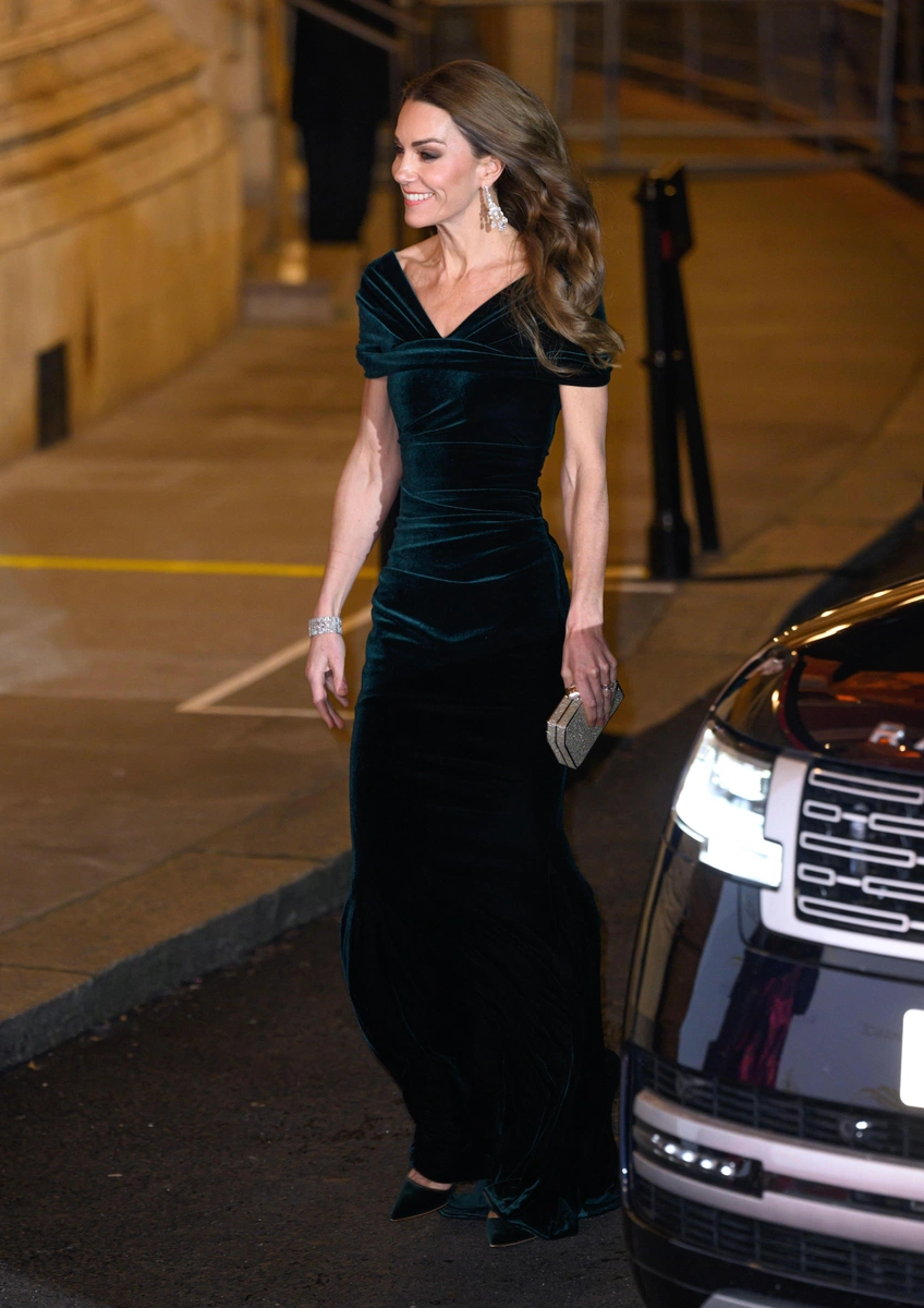 Кэтрин выбрала образ, который моментально разошелся по британским таблоидам: платье из глубокого зеленого бархата в пол от Talbot Runhof, идеально подчеркивающее ее фигуру. Мягкий блеск ткани, аккуратный силуэт и насыщенный оттенок создали тот самый королевский эффект, к которому давно привыкли поклонники принцессы Уэльской.
