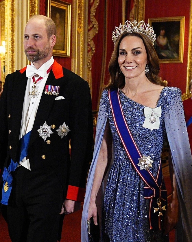 Принц Уильям тоже выбрал бархат — черный смокинг и галстук-бабочку в тон, создавая визуальный дуэт с женой.