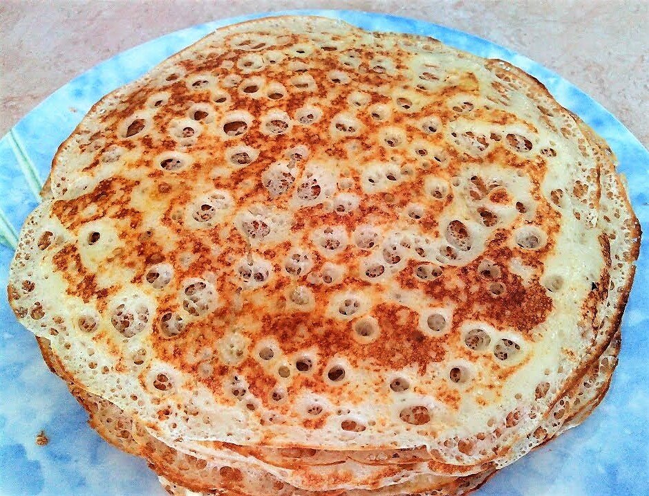 С дырочками дрожжевое получается очень просто. В любом рецепте сначала делаете как опару: немного молока, сахара, чуть муки и дрожжи. Даёте подняться минут 20, потом все остальное вмешиваете. На литр молока грамм 7 дрожжей