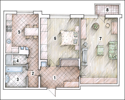 Унас такая квартира, конечно, хотелось бы побольше, у нас двое родителей и две дочки)) Сразу скажу- воздуховод пожалуйста не трогайте- соседям дышать будет нечем. У нас так пол-стояка переделали- вентиляции никакой! Кухня не огромная, конечно, но нармально все умещается. Мы сделали угловую кухню, у окна холодильник, узкий шкафчик вдоль короба, на коробе телефизор (типа как у Колбасищи))), стол и стулья (диванчик не стали ставить, места моловато). Встроенный шкаф в коридоре- рядом с ванной (там полки- очень много чего умещается, даже мужнина хоккейная сумка))), в маленькой у нас родительская спальня (давно мечтала)), в большой детская- большой встроенный шкаф сделали вдоль стены, которая напротив окна с балконом, 2 писменных стола, кровать двухярусная (девченкам нравится). Если интересно завтра сфоткаю- покажу. Ремонту уже больше года- пока почти все нравится.