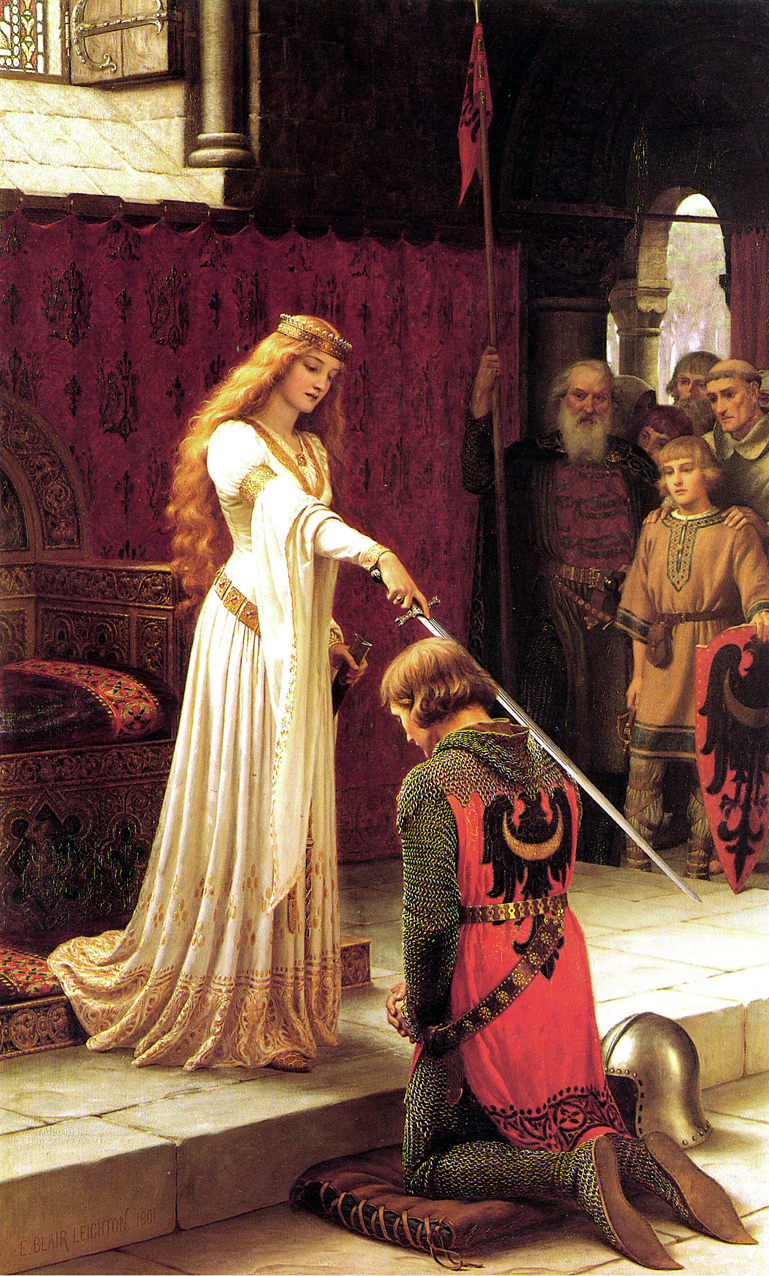 Где рыцари прощаются с девушками, уходя на войну. Таких много у разных художников.
