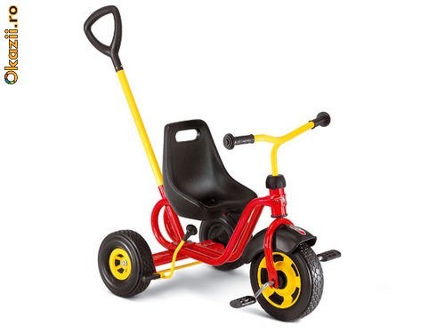 У нас такой. Педали не крутит, отталкивается ногами как на машинке :) А я за ручку держусь. У Юли был другой, девАчкового цвета - тоже педали не крутила - там до них далеко было - не доставала. В 2,5 года пересела на беговел (или как его - велик без педалей).