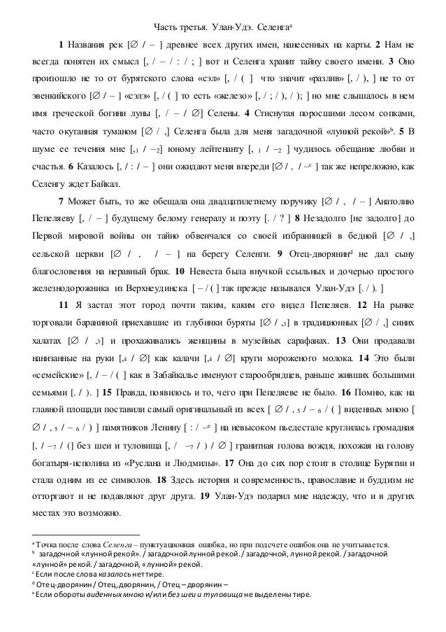 Когда пришли в первый день проверять диктанты и прослушали инструктаж, были немало озадачены: почти все ошибки при проверке за ошибки считать не надо. В итоге по третьей части действительно сложных мест оказалось несколько: кавычки при всех этих "сэлэ", поручик, ненужная запятая между бурятами и женщинами, мороженое молоко, запятая вместо тире или скобок перед "так прежде назывался Улан-Удэ", пьедестал. В грамотных работах, претендующих на оценку выше двойки, ошибки встречались именно в этих местах в подавляющем большинстве случаев. (Очень обидно было, когда в работе, " идущей на пятёрку", было написано без кавычек название "Руслан и Людмила" - а это уже орфографическая ошибка и четвёрка...)