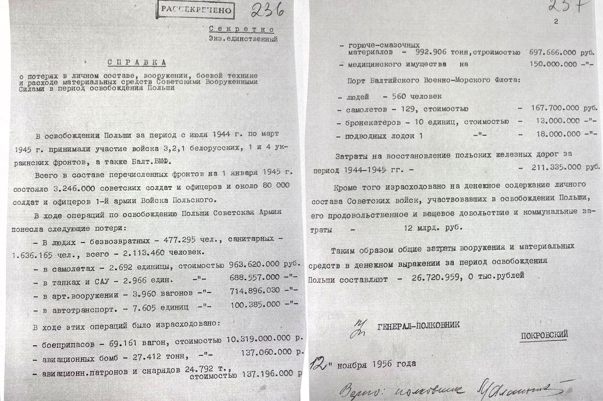 В ответ на недавнее заявление Президента Польши Анджея Дуды о том, что Россия, как и Германия, должна выплачивать его стране репарации за ущерб, нанесенный в ходе Второй мировой *** – историки РВИО предъявили документ 1956 года за подписью генерал-полковника Александра Покровского.