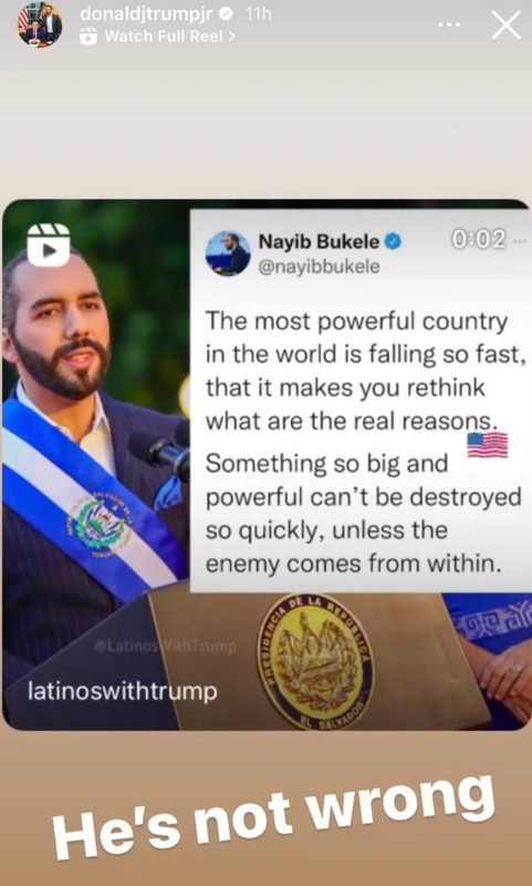 "Самая могущественная страна в мире (США) падает так быстро, что возникает вопрос, какова реальная причина этого. Что-то столь великое и могущественное не может быть уничтожено так быстро, за исключением случаев, когда враг приходит изнутри"