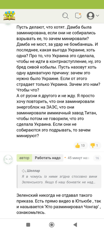 Для РФ подрыв плотины не то, что не выгоден, а ужасно убыточен. Плюс, на сколько мне известно, в зоне затопления находились укрепления, сделанные РФ, следовательно это не РФ. Уж не говоря о том, что такие вещи, как эта, устраивают только США и их марионетка Зеля, которая, похоже, решила обхитрить работодателя, рожа дебильная.