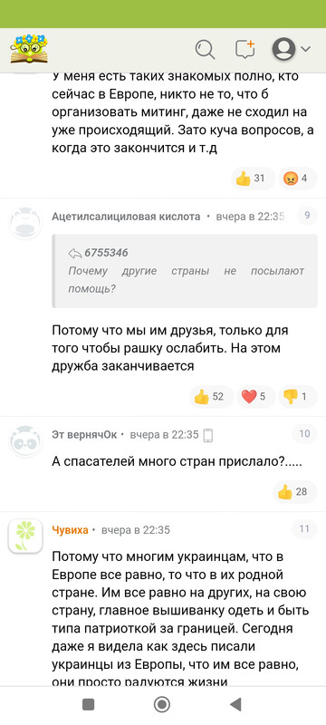 Удивительный уровень тупости. Европейцы уже прозрели, уже даже не вижу слов сочуствия украинцам вообще. Действительно, пишут, какой Пу***н молодец, скорее бы Россия победила и настал бы мир, задолбали всех украинцы и их клоун. И только эти кастрюлеголовые продолжают свою песТню "Пу****н напал на бедных украинцев" - уже никто не хочет это слушать.