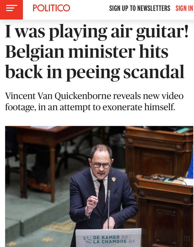 «Я не притворялся, что писаю, я просто играл на воздушной гитаре, заявил журналистам министр юстиции Бельгии Винсент Ван Квикенборн, широко известный как «Шустрик», в ответ на «пипи-гейт» - скандал, сделавший заголовки бельгийских газет после празднования его 50-летия. Трое гостей попали на камеры наблюдения, когда мочились на полицейские фургоны, припаркованные у дома министра. Офис Ван Квикенборна опубликовал заявление, что министр «не одобряет такое поведение», не присутствовал при инциденте и не знал о нем. Но новая видеозапись оспаривает его утверждение: министр выходит на улицу около 4 часов утра, стоит на тротуаре, откинувшись назад, «притворяясь, что мочится». Ван Квикенборн выступил со своим видео, пытаясь оправдаться. И рассказал, что там видно, как он делает движение, но это была «воображаемая игра на гитаре», а не «мочеиспускание».