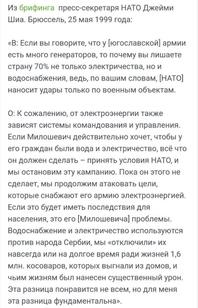 Водоснабжение и электричество, хоть и не являются военными объектами, но «используются против народа Сербии», и войска НАТО «отключили» их навсегда или на долгое время ради жизней косоваров.