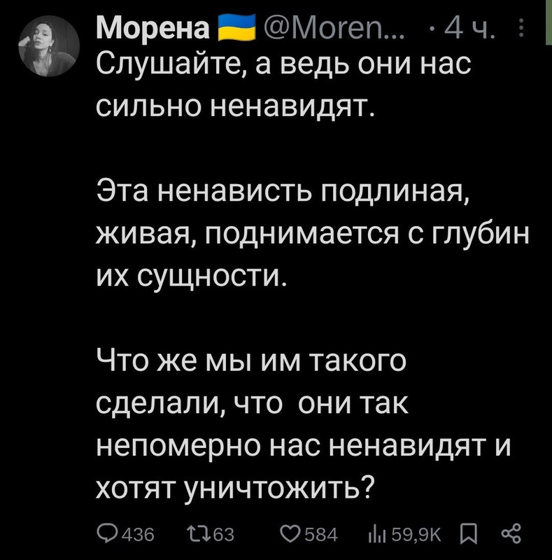 Если что, я за СВО, но объективная реальность такова, что мы к ним пришли, и от нашего оружия гибнут не только военные, но и мирные граждане. Да и военные это же еще недавно их мирные мужья.