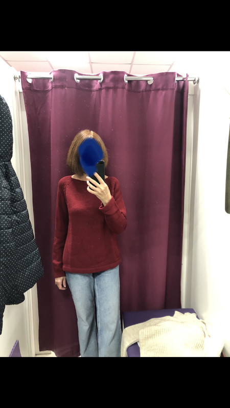 По твоему запросу и цвет и ворот.И мне нравится как он на тебе сидит. Главное не в обтяжку. Наверное с тёмными или серыми брюками будет интереснее.И может чуть заправить впереди чтоб немного с напуском как я красный заправляла?