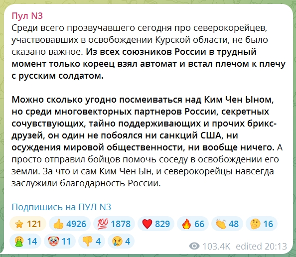 "Вот что еще важно отметить: вся мощь разведывательного сообщества западного мира работала в пользу формирований киевского режима. ВПК, военно-промышленный комплекс стран НАТО, косвенное участие принимали страны, которые поддерживают киевский режим. То есть это была битва не только против Украины, это была битва против, если хотите, всех глобалистов, которые сейчас до сих пор хотят нанести военное поражение России и разрушить нашу страну. Надо смотреть вот так, глобально, на то, что происходило 264 дня в Курской области", — сказал Поддубный.