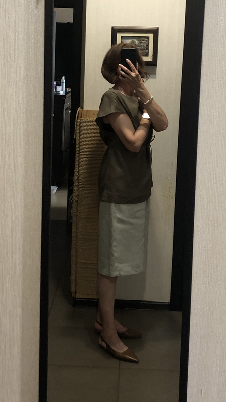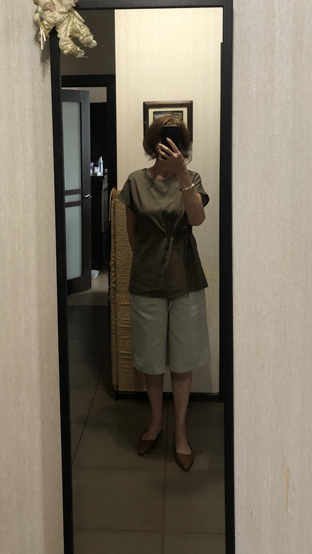 Мне кажется, что эффект советской тетеньки из-за босоножек на каблучке (хотя они и прикольные). С сандалиями/шлепанцами было б иначе, думаю)