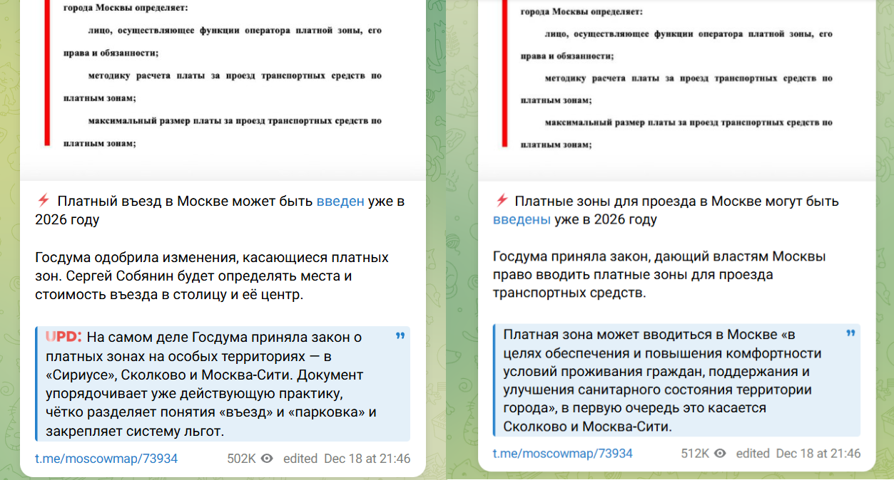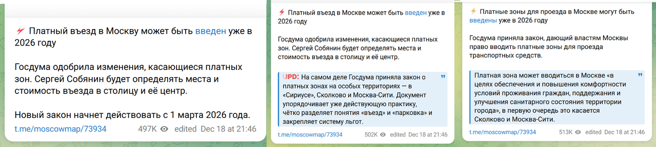 Границы платных зон в Москве, а также стоимость въезда и порядок предоставления льгот будет определять мэр столицы Сергей Собянин. Правительству Москвы будет дана возможность сделать платным въезд как в центр города или и в отдельные районы, так и в сам город. https://msk1.ru/text/incidents/2025/12/18/76178795/