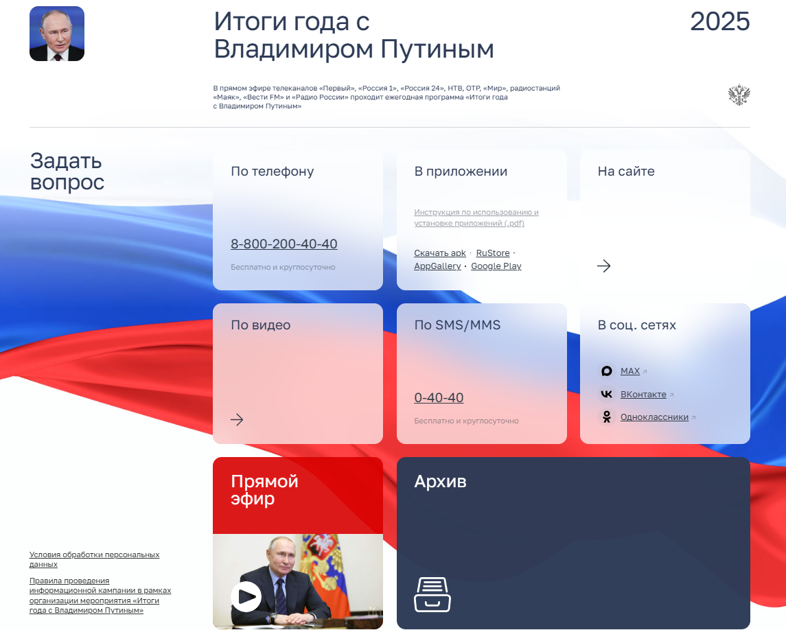 Задать вопрос президенту можно на сайте moskva-putinu.ru, по СМС/ММС на номер 0–40–40, телефону 8–800–200–40–40 или через мобильное приложение. Также доступны соцсети «ВКонтакте» и «Одноклассники» с чат-ботом MAX.