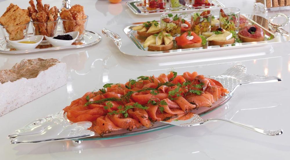 Икра в икорницах, а все что имеет вид паштета в мелких салатницах или креманках, подача типа мезе. Отдельно блюдо с тончайшими тостами (из багета, чиабатты, ржаными) и крекером, кусочками фокаччи, того же лаваша. Еще бывает из слоеного теста выпекаю кругляши, их потом разрезаю, получаются такие пятаки с углублением, на один укус.