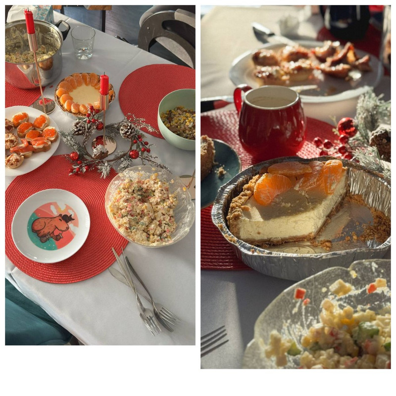 У нас в этом году получилось обычное утро с яичницей, на обед был вкусный русский борщ и даже сало нашлось в морозилке, потом поехала в магазин, увидела sushi platter по хорошей цене, купила и привезла детям, они с удовольствием стрескали это в 17ч, а потом мы в гости пошли, там стейки жарили - томагавк, ребра, ну чисто ЮАР ужин получился) к 24ч вернулись домой, открыли шампанское, достали бутерброды с икрой и ягодную тарелку. Такое вроде все едят, чего ковыряться.
