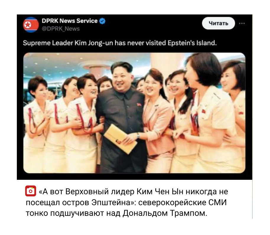 «А вот Верховный лидер Ким Чен Ын никогда не посещал остров Эпштейна»: северокорейские СМИ тонко подшучивают над Дональдом Трампом.