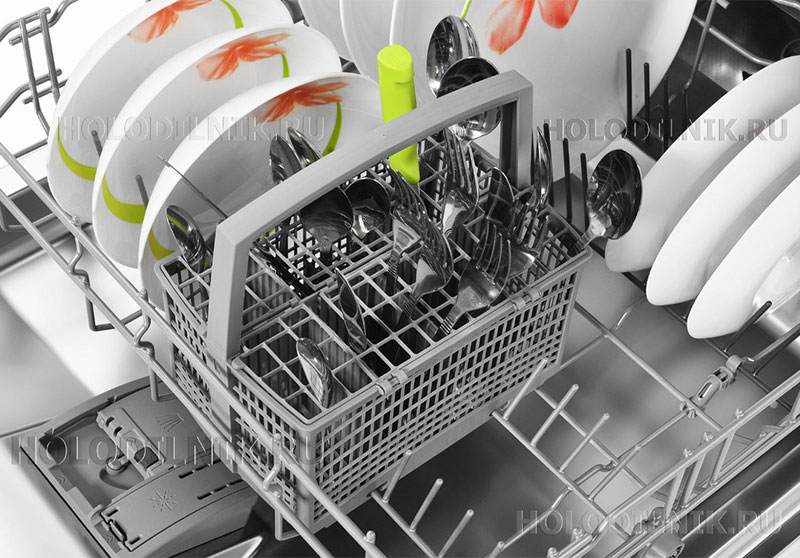Корзина всегда в одном положении, это не мешает ставить даже бокалы под бургундское. Разбрызгиватель не достает до ложек, я прям впервые слышу о такой проблеме.