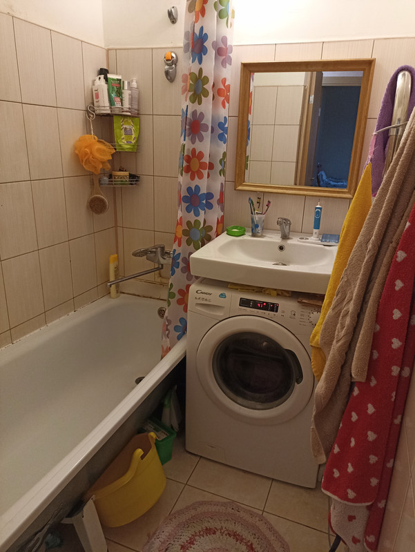 Вот фото обычной ванной, тут стирала можно разместить только под раковиной. Конструкция НЕ удобная. Именно по причине того, что когда умываешься, ноги упираются в стиралку. А если стиралка ещё и с кучей чувствительных кнопок, то это полный звездой, потому что кнопки телом нажимаются рандомно каждый раз.