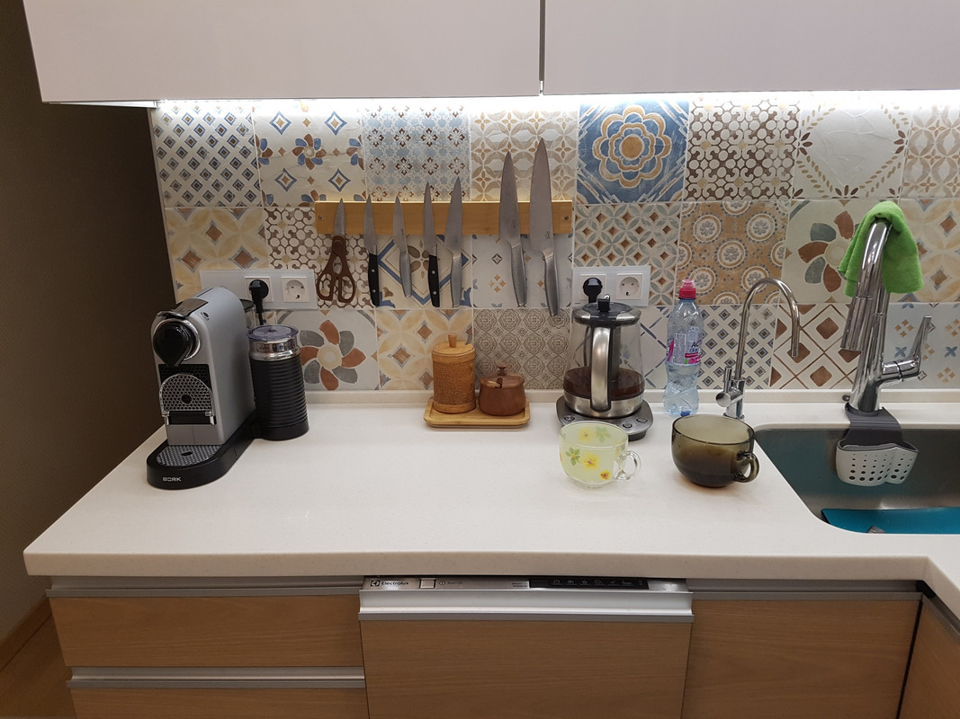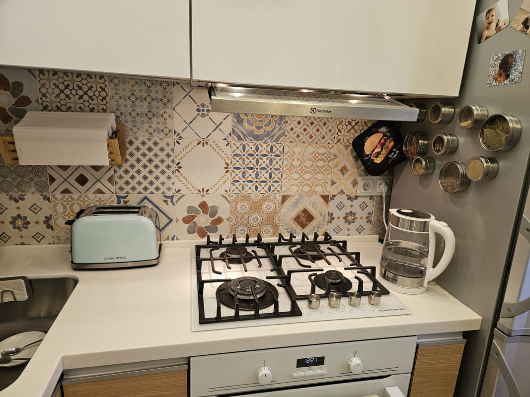 Моя кухня. Очень ее люблю, плитка на фартук очень нравится, она не яркая, спокойная, теплая и фактурная. Мне нравится ее трогать))) Розетку над плитой перенесли! Не рассчитала при разводке немного, обошлось малой кровью, заменили 2 плитки)