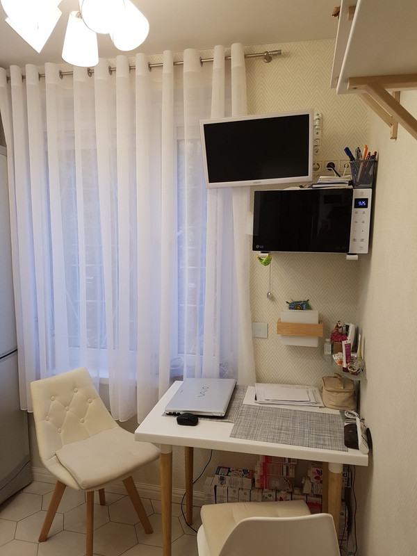 Отличная кухня у Вас. У нас микроволновка над столом , высоко. И ничего - привыкли, достаём суп горячий и не проблема))