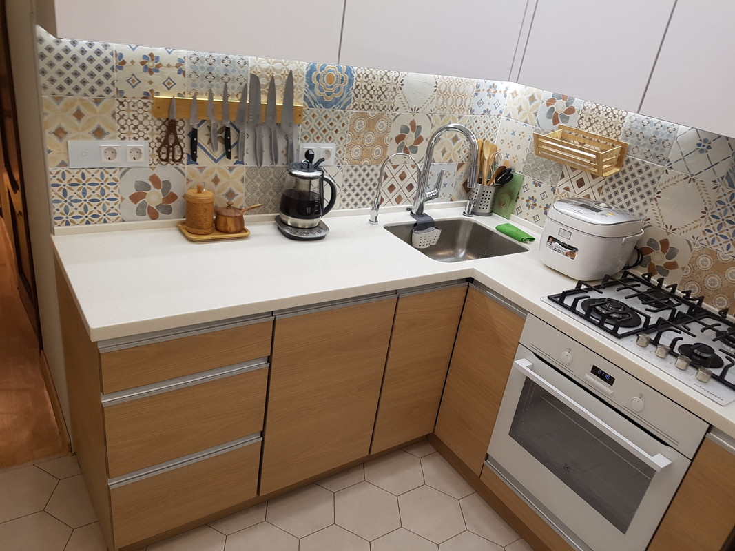 Пришлось пожертвовать раковиной посередине, чтобы сделать рабочую поверхность побольше...
