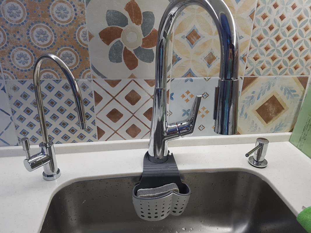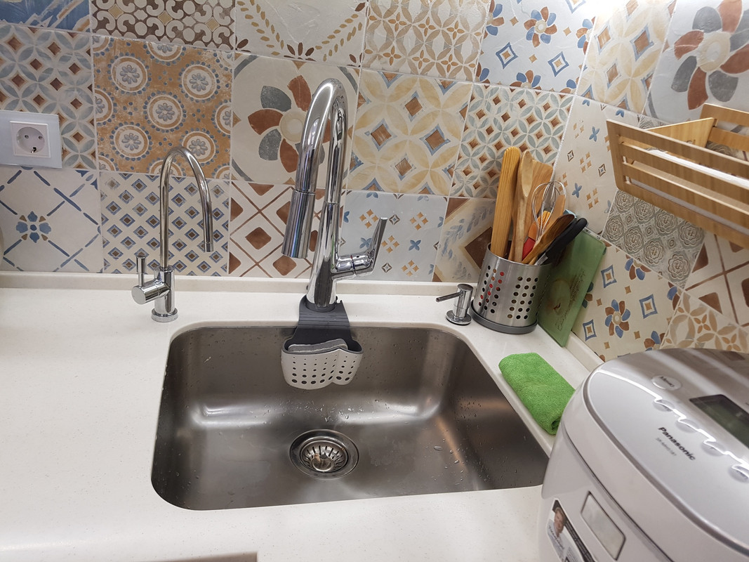 Но посуду мы особо не моем - посудомойка есть. Мелочь помыть, фрукты-овощи - проблем не возникает даже у моено мужа 187см роста))