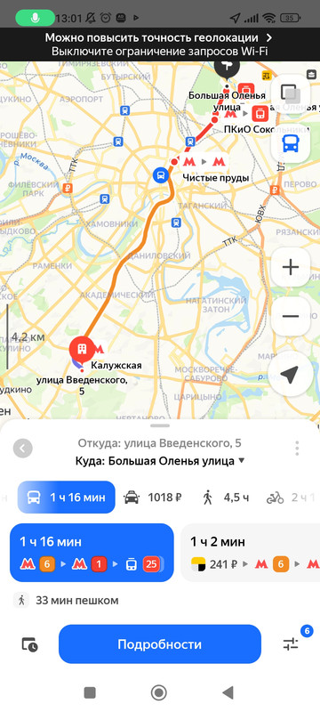 Больше часа - это не электричка. Точку поставила в Королеве подальше от станции, а в Москве подальше от метро. 1 час 6 минут - это от точки до точки.