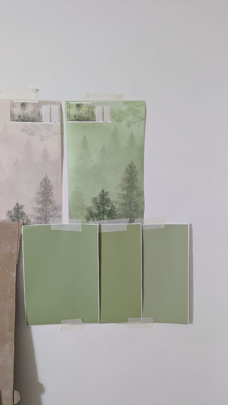 Моя нежно-болотно-туманная трансформировалась в насыщенно зеленую. Потому что цветопроба на стене в конкретной комнате превратилась в... розово-серую!!! Вот доказательство )))