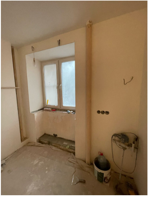 Ширина полотна 700. От ушла, где столешка, 500 отступила. Стен нет вообще. А вот канализационный стояк рядом с унитазом. От него же вести канализацию к ванне.