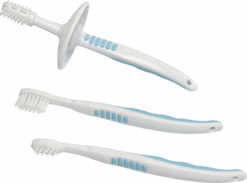 когда вспоминаю, протираю увлажненной марлевой салфеткой, потом щеточкой вожу по ним с шишечками, н уи по деснам заодно. первая операция снимает налет, а вторая просто как приучение. пото мзабирает щетку у меня и "чистит" сам. причем сначала нужной стороной, а пото мпереворачивает и ручкой "чистит2. грызет, конечно, по больше части. у нас такой набор Safety1st: http://www.bembik.ru/data/catshop/3770.jpg