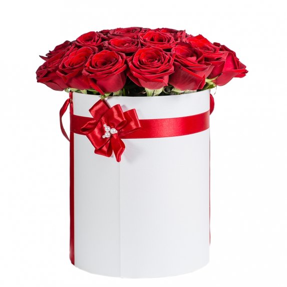 10 класс. Букет красных роз в белой круглой коробке, перевязанной красной и зелёной лентами.